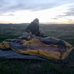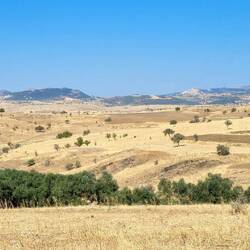 Unser erster Pausenplatz gleicht einem Schafherden-Drehkreuz. Aus allen Richtungen tauchen die netten Wolltiere in Begleitung ihrer Hirten, zumeist auf einem Esel reitend, und einer Meute Hunde auf. Wenn die berittenen Hirten aufeinander treffen, wird ein Pläuschchen gehalten, während die laut kläffenden Hundemeuten sich mutmaßlich eher als Gegner oder Konkurrenten verstehen. Auch bei uns hält ein Hirte für ein kurzes Gespräch an. Er nimmt wahr, dass wir seinen Esel sehr nett finden und steigt prompt ab, um Heiko den Platz auf seinem Reittier anzubieten. Nach kurzem Esel-Probesitzen zieht die Herde samt ihrem Hirten und seinen 12 (!) Hunden weiter, während wir uns Kaffee/Tee und Kuchen gönnen. Eine Weile radeln wir noch durch welliges Terrain weiter, bevor die Aufmerksamkeit wieder potentiellen Übernachtunsplätzen gilt. So ganz sind wir noch nicht in diesem Urlaub angekommen, Claudia ist einigermaßen platt, Heiko plagen intermittierend Zahnschmerzen und der Wind kommt uns scheinbar am allerliebsten direkt von vorne ins Gesicht geblasen. Auch die Gegenden, durch die wir bislang gefahren sind, bieten keinen Anlass für euphorische Stimmungsausbrüche. Wir fragen uns, woran das liegen mag. Sind vielleicht die sensationellen Eindrücke unserer Herbstreise noch zu präsent? Sind unsere Ansprüche dadurch zu hoch? Würden wir genauso empfinden, wenn dies unsere erste Reise in die Türkei wäre? Ist es die Spannung und der Reiz des Neuen, was inzwischen etwas verblasst ist? Wir wissen es nicht, sind aber guter Hoffnung, dass noch viele schöne Eindrücke und Erlebnisse auf uns warten. Es ist 17 Uhr, als Heiko anhält und linker Hand der Straße in einen sandigen Fahrweg geht, um die Lage zu inspizieren. Daumen hoch lautet das Ergebnis, hier können wir bleiben. Auf einem kleinen, unbewirtschafteten Stück Wiese inmitten großer Felder lassen wir uns nieder. Unter blauem Himmel verspeisen wir den traditionellen und immer wieder leckeren Gemüsetopf mit Brot. Claudia liest gebannt ihren Krimi zu Ende, während Heiko angesichts deutlich aufkommenden Windes das Zelt, bzw. den bis zu diesem Zeitpunkt lediglich vorbereiteten Footprint neu ausrichtet. Als wir es uns im Zelt gemütlich machen, nimmt der Wind weiterhin an Stärke zu und verdient inzwischen eher den Namen Sturm. Er drückt mächtig in die Zeltwände, der Zeltboden scheint an den nicht durch uns oder andere Gegenstände beschwerten Stellen durch die kräftigen Böen abheben zu wollen. Zusätzlich ist es durch die Kombination aus trotz fester Abspannung flatternden Zeltplanen und dem Rauschen des Windes so laut, dass man sein eigenes Wort kaum verstehen kann. Am schlimmsten erweist sich aber die Tatsache, dass der Sturm feinen Sand in das Innere des Zeltes treibt (Heikos Flüche sind an dieser Stelle nicht zitierfähig...). Der Zeltboden, die Schlafsäcke und alles, was nicht nicht innerhalb von Tasche oder dergleichen befindet, ist bald von einer rötlichen Staubschicht überzogen. Der Blick nach draußen verheißt nichts Gutes. Finster sieht es aus am Horizont, ein Gewitter erscheint uns nicht unwahrscheinlich. Was das wohl für eine Nacht wird...