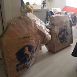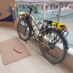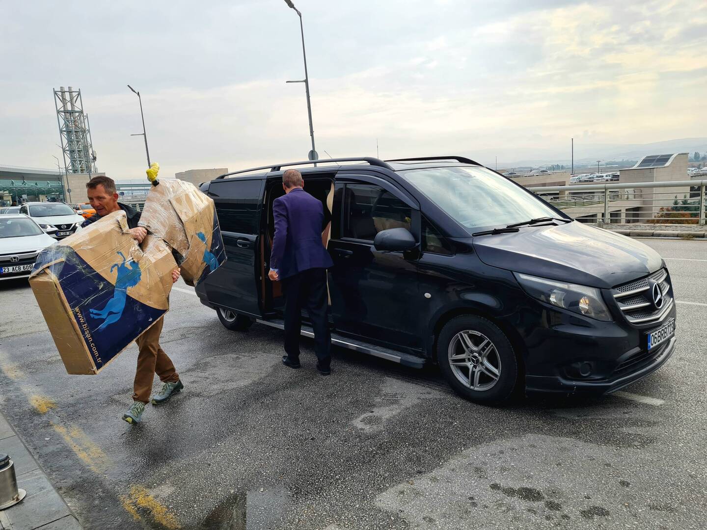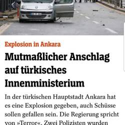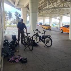 Zwischen unserem Gepäck lassen wir uns am Morgen unser Frühstück schmecken, bevor wir um neun Uhr von unserem zuvor bestellten Flughafen-Shuttle abgeholt werden. Kurz schaut der Fahrer etwas ratlos, als er unsere (mit Foto angekündigten...) verpackten Räder sieht, verfrachtet sie dann aber doch zügig mit Hei(kos Hilfe in des Fahgastraum des Mercedes Vito. Überpünktlich erreichen wir den Flughafen, wo wir uns dank des aufmerksamen und netten Personals sehr schnell und unproblematisch unseres Gepäcks und der Räder entledigen. Während wir auf unseren mit Verspätung angezeigten Abflug warten, stolpern wir über folgende Meldung der Nachrichten: "In der türkischen Hauptstadt Ankara hat sich am Sonntag­morgen eine Explosion ereignet. Das Innenministerium sprach von zwei „Terroristen“, von denen sich einer vor einem Eingang zu dem Ministerium in die Luft gesprengt habe." Diese Zeilen lassen uns besonders angesichts der Tatsache, dass wir erst gestern noch genau an diesem Ort entlangspaziert sind, innehalten.