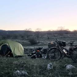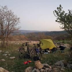 Auf dem erreichten Höhenniveau geht es auf unserer Etappe wellig weiter. Die Landschaft ist herrlich, die Fahrt ein Genuss. Und wenn wir noch vor zwei Tagen leichte Zweifel hegten, heute sind sie wie weggeblasen. Felsig zeigt es sich hier und da, ansonsten viel saftiges Grün und stets die Aussicht auf ein Postkartenbergpanorama. Nach unserer heutigen Chipspause radeln wir deutlich weiter als ursprünglich geplant, was einen strategischen Grund hat. Für morgen ist laut Wettervorhersage erneut Sturm angekündigt. Auch von den Männern, mit denen wir Tee getrunken haben, erhielten wir eine entsprechende Warnung. Der "Lodos" werde morgen erwartet, ein Wind aus Süden oder Südosten, der mit Sturmböen oder auch schweren Sturm- bis orkanartigen Böen einhergehen kann. Jaja, wir haben ihn schon kennengelernt, diesen Schurken, nun kennen wir auch seinen Namen. Unser Plan sieht vor, heute die Ruhe vor dem Sturm zu nutzen und möglichst weit zu fahren, um morgen vor Einsetzen des gegen Mittag erwarteten starken Windes die Stadt Ortaköy und mit ihr ein windgeschütztes Hotelzimmer zu erreichen. Im Idealfall zieht der Sturm durch, wenn wir mal wieder uns und unsere Kleidung einer Reinigung unterziehen und sämtliche elektronischen Geräte mit Strom versorgt werden. Als die Tachos noch 28 Restkilometer bis Ortaköy anzeigen, stellen wir unweit der Straße unser Zelt an einem Feldrand auf. Während wir uns noch fragen, auf wen oder was die vielen Löcher im Boden zurückzuführen sind, zeigen sich tatsächlich die Bewohner der unterirdischen Höhlen: Ratten sind es, die im Untergeschoss unseres Zeltes hausen. In der Hoffnung, dass sie sich nicht durch den Zeltboden knabbern und wir über Nacht neue Mitbewohner bekommen, kriechen wir in unsere Schlafsäcke.