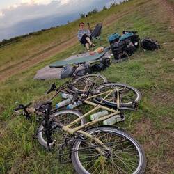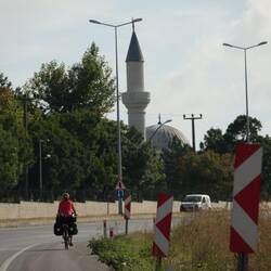 Zeitig stehen wir heute auf und packen unsere Taschen, es soll schließlich weitergehen gen Südosten. Nach dem Frühstück verabschieden wir uns von den Gastgebern unseres netten Hotels und von dem Ort Edirne. Nach einem letzten Blick zurück auf die Stadt lotst unsere Wegführung uns recht bald auf eine sandige Schotterpiste. Da diese wegen einer großen Baustelle nicht wie auf der Karte angegeben nach einigen Kilometern auf die Straße trifft, müssen wir einen eher beschwerlichen Umweg über unbefestigtes Terrain in Kauf nehmen. Als wir dann doch noch die Straße erreichen, wird es auf andere Art ungemütlich. Auf der Hauptstraße herrscht sehr reger Verkehr, besonders die vielen LKW empfinden wir als sehr lästig und anstrengend. Wir fahren durch bis zum Ort Havsa, wo wir uns eine Verschnaufpause von Autolärm und Abgasen gönnen und Proviant einkaufen wollen. Einen ersten Einkauf erledigen wir in einem Supermarkt, später verleitet uns noch die Auslage einer Bäckerei zum Anhalten. Wir blicken noch durch das Schaufenster, als der Inhaber hinauskommt und quasi darauf besteht, dass wir auf einen Kaffee hineinkommen. Er serviert uns mit Käse bzw. Oliven gefüllte Brötchen, Baklava und Kaffee, erzählt von seinen Reisen durch Europa, seinen beiden Töchtern und von seiner etwas wirren Überzeugung zu Corona. Geld möchte er vehement keines von uns, Reisende ließe man nicht ohne gastfreundlich Bewirtung vorbeiziehen, so sage es der Prophet. Nun gut, wir bedanken uns herzlich für die Einladung und radeln weiter, und zwar leider zurück an die lästige Hauptstraße. Stumpf spulen wir unsere Kilometer ab, sind dabei zusehends genervt von dem dauerhaft an uns vorbeirauschenden Verkehr. An einer Tankstelle füllen wir unsere Wasservorräte auf, als es irgendwann langsam Zeit wird, Ausschau nach einem Schlafplatz zu halten. Die Suche gestaltet sich schwieriger als erwartet, rechts und links der Straße sind entweder Gebäude oder aber weite Felder und Äcker ohne auch nur einen einzigen Baum. Die Bedingungen, um sich mit einem kleinen Zelt "unsichtbar" zu machen, sind entsprechend denkbar schlecht. Wir biegen schlussendlich in einen Schotterweg ein und schwenken nach wenigen Metern auf ein Feld, an dessen Rand wir uns postieren. Da selbst auf dem Schotterweg noch regelmäßig Autos und LKW verkehren, widmen wir und erst dem Abendessen und stellen unser Zelt erst bei Anbruch der Dunkelheit auf. Um halb neun ist draußen bereits zappenduster und wir liegen in unseren Schlafsäcken.Læs mere