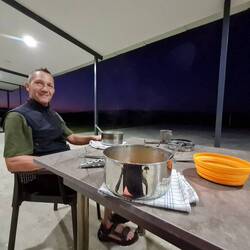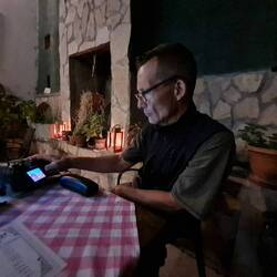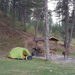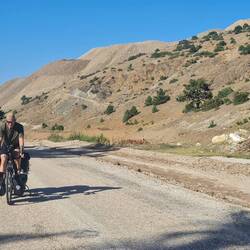 Angesichts der Tatsache, dass heute eine anstrengende Etappe auf uns wartet, stehen wir um halb sieben auf und packen unsere Taschen. Nach dem Frühstück erledigen wir noch einen Einkauf und können ein Erfolgserlebnis verzeichnen, dass uns gleichermaßen freut wie erleichtert: Das empfohlene Geschäft hat geöffnet und hat Gaskocher im Angebot! Die warmen Mahlzeiten für den Rest der Reise sind endlich gesichert, unser Tipp-Geber erhält noch einen Dank per WhatsApp. In der Tiefgarage checkt Heiko noch einmal die Fahrräder, danach rollen wir los. Die ersten Kilometer sind noch harmlos und unspektakulär, bereits hier freuen wir uns aber schon über den bewölkten Himmel und die heute nicht ganz so heißem Temperaturen, denn es steht noch der Anstieg auf den bislang höchsten Punkt der gesamten Tour an. Als wir einen Ort passieren, um uns für drei Tage mit Proviant einzudecken, lernen wir vor dem Supermarkt Ali kennen, der gemeinsam mit seiner aus Stuttgart stammenden Ehefrau auf Familienbesuch in der Gegend ist. Kurz darauf stößt dann auch seine Frau dazu, die Unterhaltung in deutscher Sprache wirkt fast etwas ungewohnt. Die Einladung zu Ali und seiner Familie nach Hause zum Tee müssen wir leider ausschlagen, da wir zu diesem Zweck einen Umweg in die entgegengesetzte Richtung unserer Route in Kauf nehmen müssten, was uns wiederum in zeitliche Bedrängnis bringen würde. Ali gibt uns noch seine Telefonnummer, unter der wir uns jederzeit bei Hilfebedarf melden dürfen, dann verabschieden wir uns. Damit beginnt nun auch der anstrengende Teil des Tages. Anfangs auf Asphalt, später auf staubiger Schotterpiste arbeiten wir uns mit unseren Rädern bergauf. Auf einer Höhe von knapp 1700m haben wir es schließlich geschafft, der höchste Punkt ist erreicht, was auch einen neuen Höhenrekord auf dem "Kurs Südost" bedeutet. Gehofft hatten wir als Belohnung für die Mühe auf ein schönes Plätzchen für die Nacht in dieser Höhe mit schöner Aussicht, diese Hoffnung erfüllt sich jedoch nicht. In Ermangelung eines geeigneten Fleckchens für unser Zelt fahren wir weiter, diesmal zunächst auf Schotter und später auf frisch gepflasterter Straße bergab. Einen perfekten Ort entdecken wir nicht mehr, so fällt die Wahl am Ende auf ein beschildertes Picknick-Areal. Laut Schild ist hier das Campieren zwar verboten, aber wir beschließen, dass unsere Sprachkenntnisse für das Verstehen dieser Aussage nicht ausreichen. Außer uns tummelt sich noch ein Hund auf dem Gelände, der aber stets reichlich Abstand zu uns wahrt. Bald köchelt frisches Gemüse auf dem Gaskocher und das Zelt ist aufgebaut und eingerichtet.Læs mere