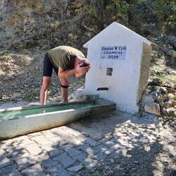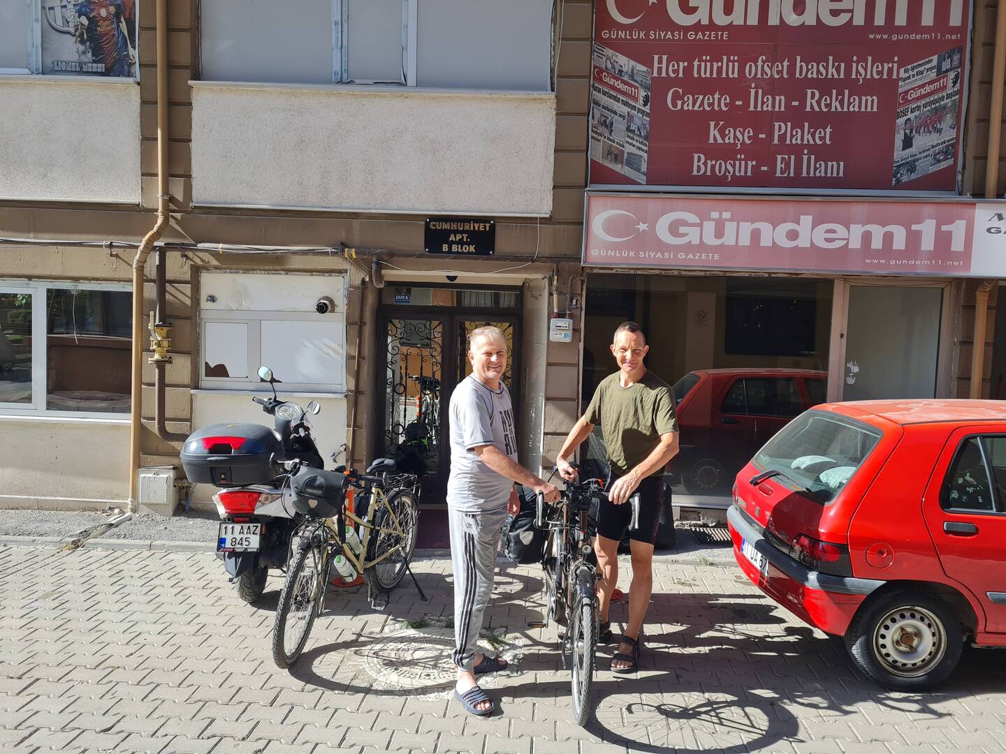 Als wir um viertel vor acht aufstehen, herrscht bereits reges Treiben in der Wohnung. Yılmaz, Çiğdem und Ayberk erwarten uns bereits in der Küche mit einem Frühstück bestehend aus Sımıt (Sesamkringeln), Pogaca Teigtaschen) mit zweierlei Füllungen, Käse, Wurst, Oliven und natürlich reichlich Çay. Von Çiğdem und Ayberk müssen wir uns bald verabschieden, die beiden müssen zur Arbeit. Schnell noch ein gemeinsames Foto gemacht und schon sind wir mit Yılmaz, der aufgrund einer Herzerkrankung bereits berentet ist, allein. Zwei bis drei Tee später fangen wir an, unsere Sachen für die Abreise zu packen, Yılmaz verstaut uns noch die Reste vom Frühstück als Proviant in einer Tüte. Anschließend begleitet er uns noch nach unten und wartet, bis wir unsere Räder beladen haben, um zum Abschied zu winken. Wir erledigen noch schnell unseren üblichen Einkauf, dann verlassen wir den Ort Bozüyük. Erneut warten heute wieder viele Höhenmeter darauf, von uns bezwungen zu werden. Bei sonnigem Wetter arbeiten wir uns nach oben, eine Wasserquelle am Wegesrand bietet eine willkommene Abkühlung während der ansonsten recht schweißtreibenden Fahrt. Nach gut 25km haben wir den ersten Gipfel des Tages auf etwa 1200m erreicht, 5 weitere Kilometer später lassen wir uns im Schatten eines Baumes neben einer Wasserquelle zur Pause nieder. Inzwischen ist es fast so etwas wie Routine geworden: Nach erklommenem Gipfel belohnen wir uns mit salzigen Chips. Ein älteres Ehepaar hält mit dem Auto an und bedient sich an der Wasserquelle, der Fahrer des Autos begrüßt uns und zaubert sechs Tomaten aus seinem Kofferraum und schenkt sie uns. Zu dem Frühstücksresten, die Yılmaz uns eingepackt hat, passen sie hervorragend, werden also direkt vertilgt. Während unserer Pause entdeckt Heiko ein scheinbar vergessenes Handy an der Wasserquelle, nicht viel später fährt erneut das Auto mit dem älteren Ehepaar vor und der Fahrer freut sich sehr darüber, sein Telefon zu sehen. Die beiden setzen sich kurzerhand zu uns auf den Boden, nehmen unser Keksangebot an und plaudern, so gut es eben geht, mit uns. Wir beschließen, dass wir auch die kommenden beiden Steigungen heute noch in unser Radelprogramm aufnehmen und uns dann einen Schlafplatz suchen. Das bedeutet zwar noch etwas Anstrengung, hat aber den charmanten Nebeneffekt, dass wir morgen fast nur bergab fahren müssen. So strampeln wir also in der immer karger werdenden Landschaft Meter um Meter nach oben. Gegen 18 Uhr haben wir es nach knapp 1000 erradelten Höhenmetern für heute geschafft. Wie geplant erklären wir die nächste geeignete Stelle zu unserem Nachlager. Im letzten Tageslicht gibt es Tee und gekochtes Gemüse mit Nudeln, dann zwingt uns auch bereits die wie immer sehr schnell hereinbrechende Dunkelheit ins Zelt. Gute Nacht!Læs mere