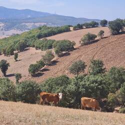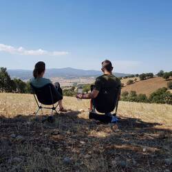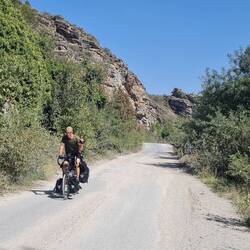 Der erste morgendliche Blick aus dem Zelt offenbart einen ziemlich großen Hund, der auf der Zufahrt zu unserem "Camping-Spot" in der Sonne liegt. Er ist glücklicherweise völlig harmlos und beobachtet uns nur aus der Ferne. Später stellen wir fest, dass der Hund zu einem der älteren Herren gehört, die uns gestern das Übernachten auf diesem Grundstück erlaubt haben. Er begrüßt uns freundlich und schenkt uns einige Walnüsse, danach widmet er sich seiner kleinen Ziegenherde (+ 1 Schaf). Wir genießen derweil unser Frühstück und räumen anschließend unseren Lagerplatz. Ein paar Kilometer radeln wir noch am İznik Gölü entlang, bevor wir uns von diesem abwenden und den ersten Anstieg des Tages in Angriff nehmen. Auf 400m geht es hinauf, unterwegs passieren wir das eine oder andere kleine Dorf. Die Einkaufsmöglichkeiten sind allerdings eher dürftig, in den kleinen Läden gibt es weder Obst noch Gemüse (dafür Chips und Kekse...). Schön ist es, abseits der Stadt auf kleinen Straßen mit kaum Verkehr zu radeln. Je höher wir kommen, desto schöner präsentiert sich die schluchartige Landschaft mit ihren Felsformationen. Am höchsten Punkt angekommen gönnen wir uns eine Pause: Heiko lässt die Drohne für eine Flugrunde aus dem Koffer, Claudia liest, dazu gibt's Tee und Kekse. Die ganze Zeit werden wir dabei neugierig beäugt und umrundet von einem sehr ängstlich und schreckhaft wirkenden Hund. Ein paar Tropfen Regen bekommen wir ab, als wir unsere Pause beenden und die Abfahrt in Angriff nehmen wollen, glücklicherweise hat sich aber das Anziehen der Regenjacken kaum gelohnt, so schnell war es wieder trocken und sonnig. Wir finden im Verlauf des Tages tatsächlich noch einen kleinen Laden, der zumindest Dosenbohnen in Tomatensauce im Regal hat, so dass wir unsere Nudeln heute Abend nicht mit Salz und Olivenöl essen müssen. Weiterhin sieht es aber so aus, dass auf den Feldern unglaublich viel Paprika angebaut wird, käuflich zu erwerben ist sie aber nirgends. Eine kalte Cola und etwas dröges Gebäck können wir noch ergattern, so dass wir für die nächste Pause verpflegt sind. Als würde unser Wunsch nach Obst und Gemüse uns auf der Stirn geschrieben stehen, hält plötzlich ein Auto vor uns an und der Fahrer überreicht uns aus dem Fenster zwei köstlich aussehende Äpfel. Wie nett! Morgen soll es hinauf auf 1000m gehen, mit dem ersten Teil des Anstieges beginnen wir am heutigen späten Nachmittag. Da es stets früh und auch schnell dunkel wird, beginnen wir ab halb sechs damit, nach einem Schlafplatz Ausschau zu halten. Auf einer Höhe von etwa 430m finden wir schließlich nach 52 Radelkilometern und knapp 700 erklommenen Höhenmetern am Rande eines Ackers ein Plätzchen für die Nacht. Noch vor dem Zeltaufbau gibt es ein 3-Gänge-Menü im Abendlicht: Geschenkte Walnüsse zur Vorspeise, Nudeln mit Dosenbohnen als Hauptgang und Kekse mit Tee zum Nachtisch. Es könnte uns schlechter gehen!Læs mere