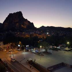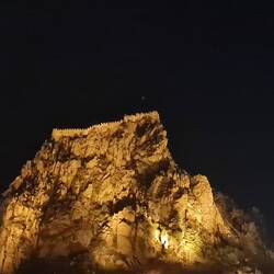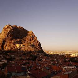 Burg von Afyonkarahisar (Afyonkarahisar Kalesi), eine um 1350 vor Chr. erbaute Befestigungsanlage. Wie es der Zufall will, findet an heutigen Tag auch der Phrygian Ultra Marathon statt, an dem auf verschiedenen Strecken ca. 1000 Läufer aus neun Ländern teilnehmen. Wir erleben den Zieleinlauf des 2km langen "Run to the Castle", der zwischen den historischen Häusern der Stadt begonnen hat. Auch Heiko wurde zum Motiv eines Sportfotografen, was wohl an seiner Bekleidung (Laufhose und Schuhe) lag. Der tatsächliche Sieger erreichte jedoch erst wenige Augenblicke nach Heiko den Gipfel. Etwa ein Stündchen halten wir uns auf, bevor es wieder an den Abstieg geht. Zurück in der Stadt versorgen wir uns mit etwas Proviant und steuern das Hotel an. Hier verbringen wir den Nachmittag mit Lesen, Wäsche waschen, Melone essen, Gepäck sortieren und Faulenzen. Am frühen Abend zieht es uns dann erneut an den Fuß des Felsens, allerdings an die andere Seite. Dieses Mal ist auch nicht der Aufstieg das Ziel, sondern die Produktion von schönen Bildern im Abendlicht. Auf unseren Campingstühlen sitzen wir auf einem Kieshügel und beobachten, wie die Sonne untergeht und der Felsen langsam aber sicher in Schatten gehüllt wird. Damit ist dann auch für uns der Zeitpunkt gekommen, ans Abendessen zu denken. Wir kehren in einem kleine Restaurant mit urigem Innenhof ein. Wir werden sofort willkommen geheißen, gerechnet hat man allerdings offensichtlich nicht mit Gästen und schon gar nicht mit Touristen. Alle Anwesenden kümmern sich um uns, mehrmals werden wir verwundert gefragt, was wir ausgerechnet hier wollen. Besonders gesprächig und interessiert zeigen sich die beiden exzellent englisch sprechenden Teenager-Töchter. Wir bestellen das einzig verfügbare und uns wärmstens ans Herz gelegte Gericht und freuen uns über die Wahl dieses netten Lokals. Da die Portion der Hauptspeise unserem Hunger nicht ganz standgehalten hat, gönnen wir uns auf dem Heimweg noch einen leckeren vegetarischen Dürüm auf die Hand und besorgen noch Baklava und Kuchen, was wir beides nebst etwas Melone und Tee zum Abschluss des Tages auf der Dachterasse des Hotels genießen.