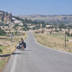 Der Wecker klingelt um sieben Uhr und heute ignorieren wir ihn nicht, sondern starten in den Tag. Wie üblich dauert es etwa zwei Stunden, bis wir in Ruhe gefrühstückt, unsere Sachen gepackt, das Zelt abgebaut und alle Vorbereitungen getroffen haben. Es ist folglich 9 Uhr, als mit einer rasanten Abfahrt unsere heutige Etappe beginnt. Wir sind begeistert von der Landschaft und der ausgesprochen ruhigen Straße, alle paar Kilometer passieren wir kleine Dörfer, in denen teilweise die Zeit stehen geblieben zu sein scheint, manch Ansiedlung mutet gar mittelalterlich an. Hirten sind mit ihren Schaf- und Kuhherden unterwegs, oft begleitet von einem bepackten Esel. Auch die eine oder andere laut gackernde Gänseschar quert unseren Weg. In einem der Dörfer verproviantieren wir uns mit etwas Gebäck und handeln uns eine erneute Absage auf dir Frage nach Gaskartuschen bzw. Kocher ein. Je weiter wir fahren, desto mehr prägen große Felsformationen das Bild. Als wir einen See, den Emre Gölü, erreichen, kehren wir in einer Art Teegarten ein, in welchem man auf kleinen, überdachten und mit Teppich ausgelegten Holzpodesten einen herrlichen Blick auf den See und die Felsen am gegenüberliegenden Ufer genießen kann. Wir freuen uns über diesen Idyllischen Platz, bestellen gefüllte Gözleme sowie den einen oder anderen Tee und lassen die Seele baumeln. Auf unserer weiteren Fahrt präsentiert sich die Landschaft immer spektakulärer, fasziniert halten wir immer wieder an, staunen und machen unzählige Bilder. Heiko fragt sich, ob wir schon in Kappadokien sind und fühlt sich an die Gegend der Meteora-Klöster in Griechenland erinnert. Und es stellt sich heraus, dass diese Gedanken gar nicht so abwegig sind. Wir stellen fest, dass wir zufällig im Phrygischen Tag (Frig Vadisi) gelandet sind, einer zweiten Tuffsteinregion, die vergleichbar zu Kappadokien ist. Die Gegend ist gespickt mit einer Vielzahl von antiken Relikten wie Feenkaminen aus Tuffstein (Peri Bacalari), in die Felsen gehauenen Wohnungen, Felsengräbern und Monumenten der Phryger. Das Radeln ist purer Hochgenuss und die Eindrücke, die wir hier zu sehen bekommen, sind gigantisch. Fast mutet es surreal an, man wähnt sich in einer Filmkulisse oder einer Mondlandschaft. In jedem Fall aber ist es großartig, wir sind schwer begeistert. Nach Verlassen des Phryger-Tals steuern wir geradewegs auf unser heutiges Ziel, die Stadt Afyonkarahisar zu. In jedem Dorf, dass wir durchqueren, halten wir verschiedenen Ladenbesitzern hoffnungsvoll das Foto eines Gaskochers unter die Nase. Wir werden zwar jedes Mal zu einem Getränk eingeladen, einen Kocher haben wir aber weiterhin nicht. Immerhin nennt ein junger Mann uns eine Adresse von einem Geschäft in Afyonkarahisar, das möglicherweise unseren Wunsch endlich erfüllen könnte. Auf einer mäßig befahrenen Hauptstraße radeln wir die letzten Kilometer in die Stadt, schon von weitem kann man den vulkanischen Felsen und die darauf thronende Burg aus dem 14. Jahrhundert ausmachen. Nicht nur, weil wir genau diesen Felsen besuchen möchten, sondern weil es auch an der Zeit ist, etwas Wäsche zu waschen, die elektronischen Geräte aufzuladen und den Radler-Beinen eine Pause zu gönnen, checken wir nicht nur für eine, sondern für zwei Nächte im MCG Marble Hotel ein. Wir gönnen uns noch einen Blick über die Stadt von der Dachterrasse des Hotels, bevor wir frisch geduscht essen gehen und endlich auch das erste Baklava dieser Reise genießen.Læs mere