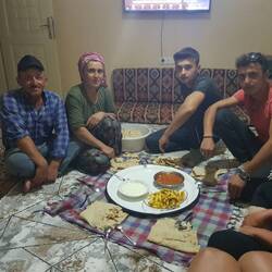 Leider hält die Idylle an unserem Platz neben dem kleinen Friedhof nicht lang. Das Zelt ist noch nicht aufgestellt, da kommt ein Mann mit geschultertem Gewehr auf uns zu. Er beginnt ein Gespräch mit uns, dem wir jedoch leider nicht folgen können, auch seinen dazugerufenen Sohn verstehen verstehen wir nicht. Die Botschaft, die er uns vermitteln möchte, scheint ihm aber sehr wichtig zu sein, mit Nachdruck wiedeholt er unermüdlich seine Worte und gestikuliert dabei wild. Irgendwann ist die zentrale Aussage entschlüsselt, es geht um Kurt. Kurt ist das türkische Wort für Wolf und von diesem gäbe es neben weiteren wilden Tieren wohl einige in dieser Gegend. Es sei zu gefährlich, die Nacht draußen zu verbringen, er lädt uns stattdessen in sein Haus ein. Der Mann namens Ahmet zieht weiter, sein Sohn bleibt bei uns, bis wir unsere Sachen wieder verstaut und an den Rädern montiert haben. Gemeinsam mit dem Sohn spazieren wir den kurzen Weg zurück in das Dorf Osmanköy zum Haus der Familie Akbaş. In der kleinen verglasten Veranda wird uns Tee serviert, zudem wird uns das Angebot der Nutzung von WLAN und Fernseher unterbreitet. Im Verlauf stoßen auch der jüngere Sohn und die Mutter zu uns, das erneute Fernsehangebot können wir nicht mehr ausschlagen. Im "Multifunktionsraum" des Hauses bekommt Heiko die Fernbedienung in die Hand gedrückt und zappt durch die Programme, die wir natürlich allesamt nicht verstehen. Ein paar Minuten flimmern die Nachrichten über den Bildschirm, dann schlägt der jüngere Sohn vor, einen Film über unterirdische Monster anzusehen. Wir, die ohnehin nichts verstehen, haben natürlich keine Einwände. Und so sitzen wir kurz darauf auf der Couch einer netten Familie in der türkischen Provinz und sehen "Im Land der Raketenwürmer " in türkischer Sprache..., skurrile Situation. Als schließlich Ahmet zurückkehrt, breitet seine Frau im selben Raum eine Decke auf dem Boden aus und serviert Abendessen. Um die Decke auf dem Boden sitzend werden alle mit dünnem Fladenbrot (Lavaş) versorgt, in der Mitte der Decke stehen Schüsseln mit gebratenen "Kartoffelstiften" sowie Yoghurt und einer Hackfleischsauce, in die das Brot gestippt wird. Im Anschluss gibt es noch eine köstliche Melone aus dem eigenen Garten und schließlich wird ein letztes Mal eine frische Decke ausgebreitet, um eine Schale mit Nüssen und Sonnenblumenkernen, welche die Familie im Gegensatz zu uns sehr schnell und routiniert knackt, zu servieren. Es ist schließlich bereits fast Mitternacht, als ebenfalls im selben Raum für uns zwei Betten hergerichtet werden. Müde, aber dankbar für diesen Abend kriechen wir unter die Decken. İyi geceler!Læs mere