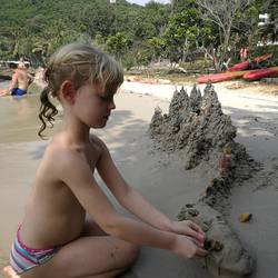 Evi wurde als erstes von einer ThaiFrau zum Burgbauen eingeladen. Es stellte sich schnell heraus, dass ihr im Schatten dösender Mann ein deutscher war, der jedes Jahr von Oktober bis März hier seine Zeit verlebt. Und als ich ihm mitteilte, dass wir anschließend nach Neuseeland weiterreisen, war er begeistert und schwärmte in höchsten Tönen von seinem 6wöchigem Trip dort mit seiner Frau und sprach uns noch einige Empfehlungen aus. Seine ThaiFrau und auch eine weitere ThaiFrau schossen erneut Selfies mit Evi und unserer Burg 🏖️ Zweitere beschenkte Evi sogar mit Chips, Trinkflasche und einem tollen Strandtuch - so dankbar war sie für Evi's Anwesenheit - wie toll 😁😆