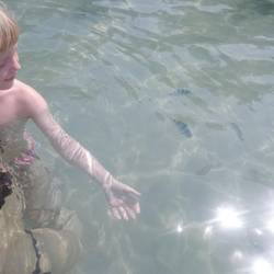 Es vergingen nur 2 Minuten, da sind wir mit 12%iger Steigung mit geschmeidigen 20km/h den ersten Hügel hochgejuckelt. Und zack hatten wir auch schon die zwei ersehnten Statuen gesichtet.🧜🤴 Danach wollte ich eigentlich nur mal eben den hochgelobten Strand der Westküste in einer Bucht anschauen, doch der war soo fesselnd schöööön ... und wir blieben erneut für 5 Stunden am "Ao Prao": total ruhig und recht leer, kein Massen-Touri-Verkehr, mit Sicht auf große Berge, diesmal keine Wellen, stattdessen glasklares hellblau-schimmerndes ruhiges Wasser mit vielen bunten Fischen darin, die uns immer schnell umzingelnten. Evi konnte die ersten 100 Meter im Wasser stehen und so war auch sie heute nicht aus dem Wasser zu bekommen, außer fürs Burgen bauen. Diesmal war dies auch mit wunderschöner bunter Muschel- und Stein-Dekoration möglich. 🐚💎
