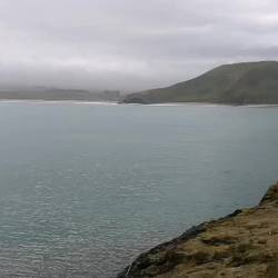 Nachdem wir uns gegenseitig getröstet und wieder gefangen hatten, inklusive Stärkung mit Marmeladentoast und Schokomilch, fuhren wir also doch nochmal los, um vllt Pinguine und Delfine zu sichten. Und nach kurzer, aber mal wieder spektakulären Fahrt über Schotterpiste direkt an den Meeresbucht in beeindruckender Höhe über dem Meer - und ja, auch hier stehen überall Schafe und Kühe - haben wir sie tatsächlich gesichtet: drei kleine Pinguine, einige fleezende Seehunde auf den großen Gesteinsbrocken und ethliche Möven. Delfine denken wir eher nicht, das Meer ist zumindest auf der einen Seite sehr stürmisch und die Wellen sind sehr hoch und peitschen gegen die Bucht. Der Fußweg bis zum Rande war mal wieder nicht sehr ungefährlich - eine Absicherung direkt an der Klippe, die sicher 20/30 Meter ganz steil abging, war teilweise recht sporadisch oder auch gar nicht vorhanden. Aber dieser Ausflug hat sich definitiv gelohnt!