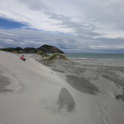 Danach geht's in einer 20 Minuten Fußwanderung bergauf und ab über Schaf-Hügel, entlang auf sehr bergigen Trampelpfad durch "Heidi's" Berg-Landschaft mit ordentlichem Abhang runterwärts, bei denen wir einen Blick auf die Bäume in unmittelbarer Nähe hatten - so hoch wären wir - dann durch einen Laubwald mit Palmen, und über den ersten Sand-Tramelpfad, schließlich über eine riesige Gras-Sand-Düne.. ab jetzt peitscht uns der Wind gewaltig um die Ohren.. und dann war vor uns: ein gaaaaaaaaaaanz weiter Strand, mit grau-weichem Sand, mit riesigen Felsbrocken im Meer samt kleiner Höhlen - bei denen man sich echt fragt wie die dahin kommen?! - mit einigen zu Häusern zusammengebauten weißen Baumstämmen, mit wenigen Muscheln zum Sammeln, ein paar Robben in der Ferne vor uns, Möven um uns, und die Sonne scheint immer und immer mehr.