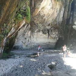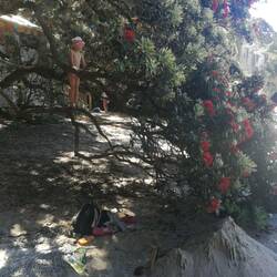 Um etwas Abstand zum "Unfallort" zu Schaffen, wechseln wir den Strand rüber auf die andere Seite der Höhle und platzieren uns zum Bleiben im Schatten unter den riesigen wunderschön rot blühenden Neuseeland-Weihnachtsbäumen, wir bauen wieder Sandburgen, ich chille in der Sonne zum Bräunen, wir beobachten die vielen Seemöven am Strand inklusive drei kleiner Babyvögel, wir gehen auf kurze Entdeckungstour in eine weitere kleine Höhle im Felsen, Evelin geht zumindest heute erstmal zur Abkühlung nicht nochmal ins Meerwasser, dafür spielt sie ausgiebig im Wasserloch: an der Felswand rangt ein großes Wurzelgeflecht geschätzte zwölf Meter tief zu uns herab, und an dieser tropft oder eher plätschert ein kleiner Wasserfall herunter - es klingt nicht nur so idyllisch, das war es tatsächlich auch! Hier haben wir den Tag bis knapp 17 Uhr genossen.. bis wir dann etwas widerwillig den Rückweg angegangen sind. Juhu.. es ging laaange und ordentlich bergauf.. Ich trage Evi natürlich wieder, denn schon nach den ersten 10 Stufen sagte sie: "Ich kann nicht mehr." - Jipppi, es folgen ja nur noch 45 Minuten aufwärts... Ganz zum Schluss ist sie schließlich noch den Restberg hoch selbst gelaufen und ich habe sie an der Hand gezogen. "Evi, komm schon, nicht Meckern. Wir müssen uns jetzt gegenseitig anfeuern!" "Dann sing doch nochmal ein Lied?" "Ne, ich brauche die Kraft und vor allem die Luft zum Atmen!!"