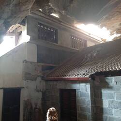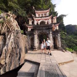 Zu Fuß geht es bei leichtem Lüftchen und hitziger Sonne satte 30min zu Fuß geradeaus bis zum Tempel. Zuerst durchqueren wir etwas die verhältnismäßig ruhige Stadt und gehen dann durch eine ländliche Gegend. In der Ferne sehen wir direkt die hier typischen Kalksteinfelsen, die grün bewachsen sind und, aus der sonst flachen Landschaft, sehr auffällig herausragen. Wir laufen solange gerade aus, bis wir diese Felsen direkt anfassen können. Weiterhin sind hier kleine, flache angelegte Seen, die mit ethlichen Seerosen bewachsen sind. Ein schmaler Weg führt uns zu einer in den Berg reingebauten Tempelanlage. Diese kann man natürlich mit einigen Stufen bergauf wieder erkunden. Vor Ort treffen wir sogar auf echte Mönche in Ganzkörpergewändern - keine Ahnung wie die das in dieser Hitze darin aushalten!