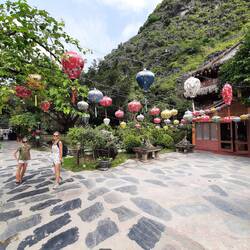 Hier erklimmen wir zunächst auf der einen Seite ethliche Steinstufen hoch zu einer Tempelvorrichtung mit Aussicht auf die Seerosemlandschaft unter uns- und auf der anderen Seite einen riesigen Drachen, der sich auf der Bergkammspitze etwa 15m lang entlangschlengelt. Für Evi reicht die Puste nur für eines dieser Highlights, weshalb wir uns teils splitten und getrennt den Drachen erleben. Unten geht's dann weiter mit einer Höhlenbesichtigung. Ein Durchgang führt uns zu einer Landschaft die aussieht wie in "Jurassic World". Danach gibt's erstmal für alle eine Pause und wir gönnen uns einen Kaffee und Eis. Zuletzt schlendern wir noch über die ziemlich große Seerosen-Seenanlage.
