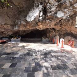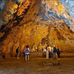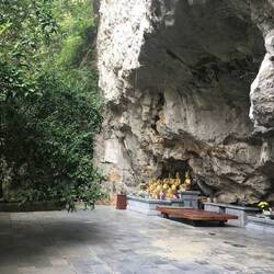 Wir fahren noch zu zwei weiteren Punkten: erst halten wir bei einem eher weniger spektakulären Grab an, danach fahren wir in einen weiteren Park in 15min Entfernung: "Tuyệt Tịnh Cốc". Hier das selbe Spiel mit Parkgebühr für die Motoroller zum selben Preis. Der Eintritt hierfür kostet uns als Familie 5,80€. Durch eine Tunnelanlage gelangt man hier in einen hübschen aufbereiteten See, kann sich eine Art "Tempel-Damm" anschauen und noch eine Höhle, in welcher wie überall auch ethliche buddhistische Gestalten aufgebaut sind uns einige Lebensmittel-Opfergaben davor drappiert sind. Hier schlendern wir mit eher letzten Kräften auch wieder alles ab, versuchen in schattiger und etwas windiger Ecke uns etwas zu aklimatisieren, freuen uns nun aber auch schon wieder auf die windige Rollerfahrt.