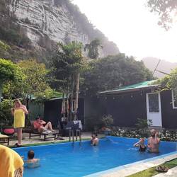 Gegen 15 Uhr checken wir in unserer neuen Unterkunft "Countryside Homestay" ein und werden freundlich von "LAN", seinen zwei Hunden und seiner Familie begrüßt. Er erzählt uns kurz was zu den örtlichen Begebenheiten und zeigt uns unser Zimmer. Aus unseren Fenstern heraus haben wir direkten Blick auf die uns umgebenden, grün bewachsenen Kalksteinfelsen. 😍 Im Zimmer räumen wir es uns erstmal gemütlich ein. Danach erkunden wir das Gelände der Unterkunft mit weiteren Zimmern, kleinen Bungalows, einem Pool, einem großen Garten, einer großen Gemeinschaftsterasse mit diversen Chill-und Fleetz-Möglichkeiten. Wir lassen uns mit einem kleinen Nachmittagsschmaus verköstigen und nutzen auch direkt mal wieder den Pool.