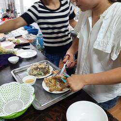 Dieser bestand dann bis etwa 13 Uhr wirklich nur aus "am Pool chillen". Als wir dann einheitlich hier im Homestay-Restaurant unser Mittagessen bestellt haben, habe ich nett nachgefragt, ob ich in der großen Küche mal mit über die Schulter schauen darf, um Einblicke in die vietnamesische Art zu Kochen zu bekommen. Und ich kann mich glücklich schätzen: Ja - ich durfte und habe zusätzlich sämtliche Antworten auf all meine Fragen bekommen. Da allerdings so viele vietnamesische Produkte dabei verwendet wurden, wirds dann doch schwer das selbst nachzukommen in Deutschland 😅