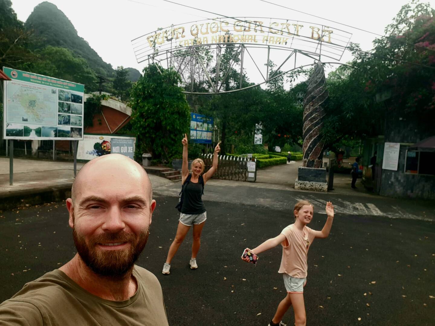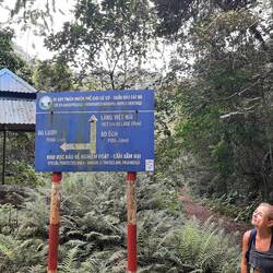 Ohne Frühstück im Magen, da es doch einfach zu früh ist, holt uns das Taxi pünktlich 7:45 Uhr ab. Für 100.000 VND werden wir 4km bis zum Eingang vom Nationalpark gefahren. Vor Ort zahlen wir erneut den Nationalpark-Tageseintrittspreis: 2x 80.000 VND für Benny und mich, 1x 40.000 VND für Evi. Und schon geht die Wanderung - zumindest für die ersten zwei Kilometer - recht harmlos und nur auf asphaltiertem Weg mit bis 10% Steigung bergauf. Wir merken auch sehr schnell, dass wir mitten im subtropischen Regenwald wandern und fühlen uns etwas nach Australien zurückversetzt. Überall klingt Vogelgezwitscher, das bei ersten Aussichten über das Walddach schallt, überall zirpt es laut und leise rum, Echsen und Frösche und sogar Waldkrebse fluchen hier rum und fast wäre Benny, als erster voraus, in eine riesige, Handgroße Spinne gelaufen, durch ein Netz auf Kopfhöhe, einmal quer über den Wanderweg. #Iiieehh..