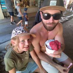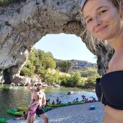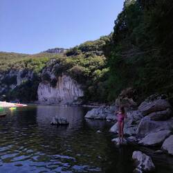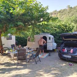 Weiterfahrt durch weinhänge, viele saftige Wälder etwas unter eine Stunde, spontaner halt: erst noch zum intermarkt, benny stellt überraschend fest dass Wurst teuer ist als Wein, letzte 7 min bis zum Campingplatz direkt am Fluss. Happy über tollen Stellplatz, benny freut sich auf klo. Wir begegnen uns zusammen dort und suchten vergeblich Toilettenpapier. Dieses musste jeder selbst mitbringen. Auf klositze wird auch verzichtet. Danach heißt es erstmals Lager aufbauen. Danach stand up paddle aufpumpen, um den Fluss lang zu paddeln. Das sollte idyllisch werden, war am. Ende auch extrem anstrengend: halbe Wanderung, da Fluss so wenig Wasser hatte. Wollten doch nur den einen Kilometer zum pont d'arc fahren.. Haben aufgegeben. Michele verblutet zwischen ihren Beinen, evi hat keine wasserschuhe an und jammert die ganze Zeit, benny schleppt die paddels über die trockenen Flussbettstellen. Gemeinsam Abendbrot essen. Geschafft vom Tag und für die Erwachsenen viel zu kurze Nacht sind wir zusammen mit evi schon halb 10 ins Bett gefallen.Read more