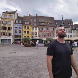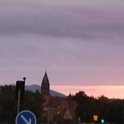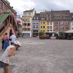 2 bis 3 Stündchen wollen wir uns hier nun die Beine vertreten, was essen und vom entfernten französischen Mühlhausen ein paar Eindrücke erhaschen. Dafür nutzen wir selbstverständlich gleich die Fahrräder. Zu sehen gab es einen tollen belebten Marktplatz mit Musikern und Gastronomie, eine tolle große Kirche, ganz schmale aneinander gereihte bunte Fachwerkhäuser und einen tollen Trinkwasserbrunnen, der bei 30 Grad uns und ein paar Täubchen Abkühlung von innen und außen verschaffte. Wir sind ein paar Gassen abgefahren und haben Zeit auf einem Spielplatz verbracht mit anschließendem Abendessen für Evi: Sie hat sich eine tolle Gemüsebowl mit Falaffel und Röstzwiebeln bestellt. Natürlich folgt mit WLAN im Restaurant direkt noch eine Videotelefonieeinheit mit Papa.