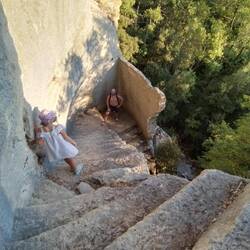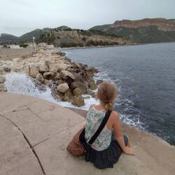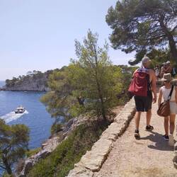 In der Hoffnung vllt doch in den Genuss vom versprochenen Schnorchelspaß zu kommen, packen wir notdürftig auch dafür Badesachen ein. Nach ausgiebigen Frühstück und Proviant zusammenpacken geht's auch schon los. Allein bis runter ins Dorf zum eigentlichen Startpunkt der Wanderung brauchen wir abwärts 30 min. Nach weiteren Schritten durch Cassis, entdecken wir evis Villa Kunterbunt am Strand. Weiter führt uns die Tour auf teils Krachsel- und teils ordentlichem Wanderweg, vorbei an hohen Felssteilwänden, die uns ans Festland erinnern, bis hin zur ersten Calanque du Port "Hafen". So wie es der Name verrät stehen hier zig Boote. Nicht wesentlich weiter grenzt auch die nächste Calanques du pin "Kiefer" an. Wir sehen aus der Ferne viele Badegäste im Wasser. Wir steigen den Berg ab, sehen am kleinen Strand das Badeverbotsschild, und dahinter etliche Badende. Vermutlich tuen wir gleich den selben Regelbruch. Wir laufen noch ein Stück weiter an der Calanques und suchen uns ein schattig schönes Plätzchen zum verweilen auf den schrägen Felsen. Benny und Mama machen sich schnorchelbereit und springen ins Wasser. Die strahlt türkisblau und ist auch unter Wasser glasklar. Endlich ist Mama in ihrer echten Urlaubswelt - im Schnorchegebiet. Evi ist leider nicht zu überzeugen und verweilt dösend am schattigem Platz. Abends geht's die ganze Tour wieder zurück. Benny wartet mit evi auf einem Bus, der die beiden wenigenstens den Berg vom Dorf zurück ins Camp schafft. Mama wählt den Fußweg, da der Appetit auf Zucchini groß ist und sie diese erstmal im Supermarkt holen möchte.
