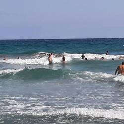 Für heute ist regen und Gewitter angesagt. Bis dahin nutzt evi erstmals noch die Zeit am Pool, bis die schwarzdunklen Wolken schließen bei uns sind und die ersten dicken Tropfen fallen. Wir haben bereits alles nach dem Frühstück wetterfest gemacht und verkrümeln uns nur noch im QEKi. Mama macht Avocado-bzw. Zuckernudeln für alle, die wir dann auch zusammen noch im QEKi essen, während draußen ein wildes Gewitter und Regen tobt. Auch haben wir wie so oft evis Buch weitergelesen. Danach war das Gewitter vorüber und der Tag konnte weiter gehen. Wie geplant satteln wir unsere Fahrräder und fahren ein Stück westwärts die Küste ab. Gerade haben wir wieder Sonnenschein pur und kommen trotzdem recht angenehmer Strecke schnell ins schwitzen. Nach 20 Minuten Fahrt halten wir schließlich an einer sehr wilden bucht mit hohen Wellen. Evi will hier nur halten weil sie keine Lust hat weiterzufahren und weil es hier einen sandstrand gibt. Wir ketten die Fahrräder an und laufen bzw klettern den Strandabschnitt ab. Schließlich ziehen wir auch unsere badesachen an, wobei Mama anfangs aufgrund des Windes und der hohen Wellen sehr skeptisch war. Wer hätte schon gedacht, dass wir alle drei, also auch inklusive evi beim Wellenreiten landen der ultra Spaß machte? Wir konnten an der Stelle gute 200m in das Wasser reinlaufen, mit Sandstrand unter uns, die Wellen waren gut einen Meter hoch und wir sprangen und stürzten uns in die Wellen. Wenn auch mit etwas Vorsicht: selbst evis hats gefallen und mitgemacht.