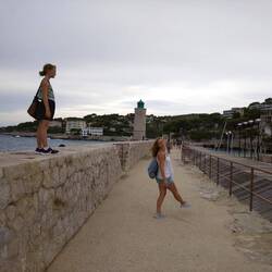 Nach dieser Auszeit packen wir erneut unsere Sachen für den Strand. Es kommt zu einem neuem Drama: Wir haben Evelin Taucherbrille vermutlich am letzten Strand liegen lassen. Und das gerade jetzt, als wir endlich in diesem Urlaub in die Schnorchelregionen schlechthin ankommen. Mit Wut und dicken Tränen in Evi's Augen schnappen wir uns die Fahrräder und düsen runter in die Stadt, 2km fast ausschließlich bergab. Wir ahnen schlimmes und viel Anstrengung für die Rückkehr zum Campingplatz. Unten angekommen ist das kleine Strändchen sehr überfüllt. Das Wasser ist etwas wild, nicht groß klar und lädt evi auch nicht zum Baden ein. Nach kurzer abkühlen wollen wir nochmal 5 min rüber zur Touristeninfo düsen. Auf dem Weg dahin verfolgt uns erneut das Pech. Wir werden von der Polizei angehalten: durch die Innenstadt von Cassis darf man nicht mit Fahrrädern fahren, noch dazu sollen wir uns bekleiden, dass laufen durch die Stadt im Bikini sei verboten. Trotzig schmeißt sich Mama das kleine Handtuch um, welche gerade so ihre Hüfte rockähnlich bedeckt und sie läuft trotzdem die 400m zur Touristeninfo. Sie schnappt sich fix ein paar Prospekte, ehe sie diesmal von der Verkäuferin darauf hingewiesen wird, dass es verboten ist in diesem Badeaufzug durch die Stadt zu gehen. Kurz darauf verlässt Mama den Laden. Gefrustet starten wir die Rücktour hoch zum Campingplatz, mal fahren, mal stark bergauf die Fahrräder schieben und ziemlich K. O. kommen wir schließlich oben wieder an. Wir machen ein Resteressenabendbrot mit Nudeln und Käsesoße, und treffen kurz danach die Vorbereitungen für die Nacht: überall stehen Warnschilder "Regenstufe II" mit Gewittervorhersage. Bis wir letztlich im Bett liegen und schlafen bleibt es jedoch ruhig.Read more