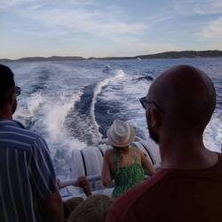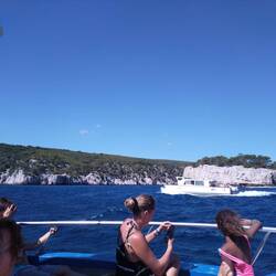 Wir entscheiden uns für ein Frühstück im QEKi, da sonst vieles einfach weggeflogen wäre. Danach chillen Mama und evi noch ne weile im QEKi, während Benny sich mal in der Stadt erkundigt bzgl. Schiffahrt. Ein geplanter ritt mit den stand-up-paddeln zur calanque d'en vau ist heute aufgrund des Sturms nicht machbar. Nachdem evelin Reste-von-gestern-abend-mittag gegessen hat, gehen auch Mama und sie in die Stadt. Nachdem wir am Leutturm bei Sturm Postkasten geschrieben haben und uns ein Eis gönnten entschieden wir uns unmittelbar für eine Bootsfahrt. Heute bieten sie leider nur die 3er-Tour an, von den insgesamt 4 verschiedenen Touren zur Calanques-Besichtigung die Sie hier anbieten. Wir buchen was heute möglich ist und sitzen unmittelbar danach schon auf dem Boot und schon sind wir auf See. Auf seeehr stürmischer See, denn sobald wir den schützenden Hafen verlassen haben, speitscht uns der Wind und das Wasser bei hohem Wellengang um die Ohren. Sehr weise von Benny sich gegen eine heutige Stand-up-paddel-Die Küste sieht vom Wasser aus betrachtet auch nochmal sehr schön aus. Hinter uns die terrakottafarbene Steilküste, vor uns das weite türkisfarbene Meer und rechts von uns der Blick auf die Calanques mit weißen Steinklippen und grün-hellgrünen Kiefern darauf. Genau dieses Farbspiel ist so typisch für diese Küste Südfrankreichs. Sobald wir in die Calanques einfahren wirds windruhiger um uns. Tatsächlich ist die letzte der dreien die beeindruckendste von allen. Wirklich riesige Klippen geschmückt mit gestaffelten Pinien umsäumen einen tief gelegenen kleinen Sandstrand, das Wasser ist glasklar und türkisblau. Stürmischer ritt zurück.