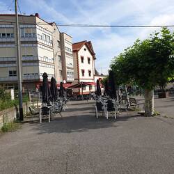 The start point of the Camino San Salvador. Taking a coffee and Sitting in the open with no rain, yet. There is Sun, occasionally. Booked into an Albergue which is very old and cramped and because ILæs mere