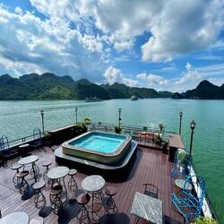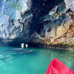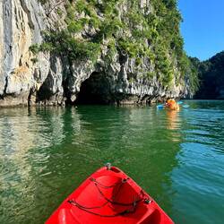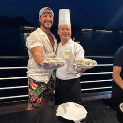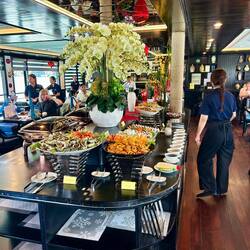 Die Verpflegung war rundum inklusive: von Buffet-Lunch bis hin zum Dinner à la Carte. 🍽️ Zwischendurch warteten immer wieder kleine Aktivitäten: Kayaking zwischen den Kalksteinfelsen, Schwimmen, Tintenfisch-Angeln bei Nacht, eine kleine Koch-Demo an Bord 🍲 und eine Tai-Chi-Session am Morgen des 2. Tages.