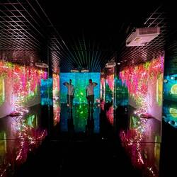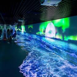 Leider hatten viele Restaurants noch geschlossen, da es vor 17 Uhr war – offenbar eine Art vietnamesische „Siesta“. Zufällig entdeckte ich während meiner Suche eine immersive Multimedia-Ausstellung im Trang Tiền Plaza, die verschiedene Ideen mit Licht und Klang umsetzte. Eine angenehme, kühle Überraschung mitten im Shoppingcenter.
