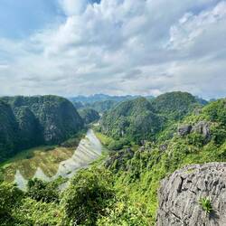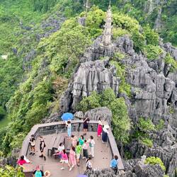 Zuerst ging es zur Múa Cave. Die Höhle selbst ist unscheinbar, doch der steile Aufstieg über etwa 500 Stufen führt zu einem grandiosen Aussichtspunkt mit einem steinernen Drachen auf dem Gipfel. Von dort blickt man über grüne Reisfelder, Flüsse und Karstberge – das war das Oberschenkel-Training und den Muskelkater an den folgenden Tagen wert. 🙃