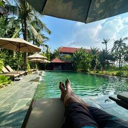 Gegen Mittag konnte ich im Hotel einchecken, ließ das Rad stehen und tauschte nach einer erfrischenden Dusche den Sattel gegen eine Sonnenliege – am Pool. 😎