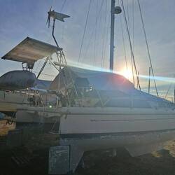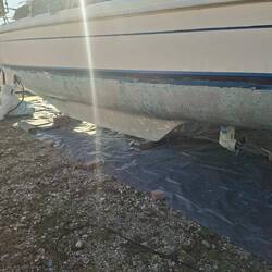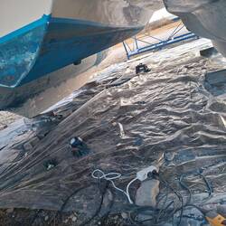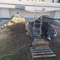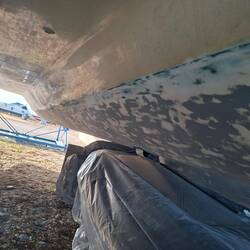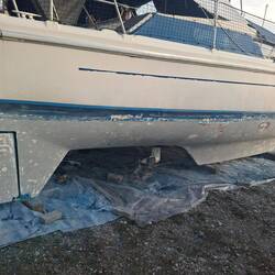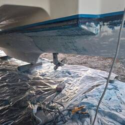 Jetzt sind wir seid dem 26.12 hier und Schleifen und beizen das Unterwasserschiff. 30 Jahre alte Schichten müssen bis auf die ursprüngliche Grundierung runter. An einigen Stellen kommen leider in der Grundierung Bläschen zum Vorschein, also war es allerhöchste Eisenbahn abzuschleifen, denn das ist die Vorstufe von Osmose. An beiden Rudern leider schon etwas vorangeschritten . Also alle Bläschen öffnen und das eingedrungene Wasser raus lassen. Man erkennt das es Osmose ist, wenn das Wasser nach Essig stinkt. Heute ist der erste Tag ohne Sonne und etwas Nieselregen, daher sitzen wir noch beim Kaffee und kommen nicht so recht in Gang. Aber da wir einen Katamaran haben machen wir bei Regen einfach an den Innenrümpfen weiter, da ist es trocken.