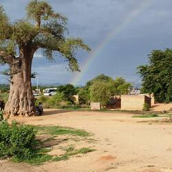 We headed out into a cool, grey, murky and misty morning more reminiscent of winter in England than Africa. We then passed through a fascinating area of high bouldered peaks which looked all the more dramatic and atmospheric in the misty grey gloom. We reached the Mozambique border just after an attempted extortion from the corrupt local traffic police. It took a long time to get through the border due the overbearing bureaucracy that is a consistent feature of officialdom in East Africa. We finally set off from the border after three and a half hours of waiting. We began our journey in Mozambique with a heavily cultivated area of maize fields with stunning bouldwred hills and mountains behind. We stopped for a toilet break and lots of young boys herding cattle chased across the fields to meet us. When they got near, Often our driver, mock chased them away which they found a funny game but were also genuinely a bit scared of us. Very few white tourists travel through Mozambique so the people find us even more if a novelty and can be even scared. We had a fun interaction with the boys who chased the truck for a hundred metres until we picked up speed. We had lots of nice waves and thumbs up from the local people living by the roadside. One mother and children started waving in rhythm with us and began to dance. The people looked quintessentially African with broad faces and very dark complexion - quite a different look than the people in Malawi. The houses were often traditional, thatched, mud-brick round houses. This felt more like an old Africa, apart from the odd transmitter and power lines giving away the use of more modern technologies. The people did not ask for money like in other East African countries as they weren't used to western tourists. We travelled through some large valleys with more dark, distant mountains standing tall amidst storm clouds gathering around their peaks. The clouds fell low creating horizontal bands of light and darker shades. A large rainbow appeared arcing across the mountains and we crossed the wide expanse of the great river Zambezi which we would meet again at Victoria falls. The truck drove on into the evening, passing a populated area with people sat around enormous baobab trees which became prominent in this part of the country. The sky coloured deep oranges and reds, and an impossibly huge African sun dipped under the clouds and slowly fell behind distant mountain silhouettes leaving a bright orange trim on the mountain tops. Soon after we turned off the road onto a gritty, sandy scrubland area where we would make our bush camp for the evening. We cooked fajitas for our dinner as the dark descended. The cloud thinned so that we could see the first quarter half moon's milky light and a few scattered stars in a big sky stretching out above the trees. There was a cool breeze outside the tents and a few of us sat out in the darkness and talked about the challenges and exertions of this type of overland travel, but inside it was very hot and humid which meant that it took a long time to go to sleep.Read more