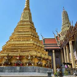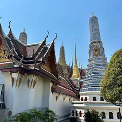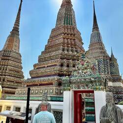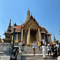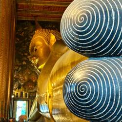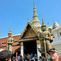 We were good tourists today. We figured out the transit system and made our way to a couple of major tourists attractions using trains and the local water taxi, which was a lot of fun. Many of the photos are places unknown viewed from the water taxi. We made our way to the Grand Palace, which is pretty darned grand, indeed. It has been the official residence of the King of Siam, later Thailand since the 1700s. It’s crazy opulent, but you’ve got to appreciate the intricate artwork of the buildings. We also visited Wat Pho, a Buddhist temple with a HUGE reclining Buddha. Our feet are tired, sore and swollen, and we currently kind of resemble that reclining Buddha, but I’m sure we’ll be recovered enough to go find some fine Thai street food for dinner in a bit. It was hot today, but not sooo bad. I did not think the humidity was awful at all. Bright sun and heat are generally ok by me.Læs mere