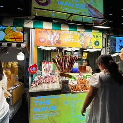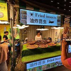 We didn’t much feel like walking yesterday, given our painful feet. My new Keen’s, which I was in love with back home, are rubbing my heat-swollen feet. Bryan’s Merrill hiking sandals rubbed blisters (he ended up going to a mall and buying Dad sneakers) and Patti’s Keen’s aren’t much better. Sooooo-we biked around two lovely parks, then spent time lazing about the hotel pool. Later however, we headed to a very cool night market, intending to take the train. Somehow we missed finding the train and ended up walking the 2 1/2 miles there. Aaaaargh! Sooooorrrrrre feeeeeet!!!! But cool food! Insects anyone?
