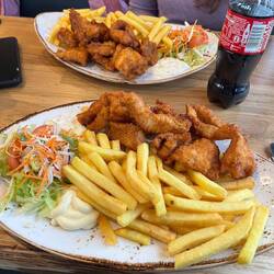 Hier gab es lecker Kibbeling mit Pommes und Salat. Von der Stadt haben wir leider nicht so viel sehen können, da das Wetter leider nicht so gut war. Es war stürmisch und regnerisch. 🫤