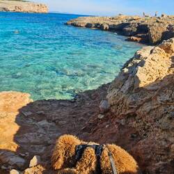 Donnerstag durfte Mama dann frei machen. Dafür muss sie nächste Woche Freitag los. Wir sind dann nach Betlem gefahren und waren wandern. Mann... das war vielleicht eine Strecke. An einem schönen Strand sind die anderen dann alle ins Wasser gegangen. Da musste ich mit! Doch plötzlich hat mich eine Welle erwischt und ich konnte ich nicht mehr stehen und musste schwimmen. Gerade so konnte ich mich auf einen Felsen retten. Für die Action hat Oma mir verdientermaßen das Freischwimmer-Abzeichen verliehen. Besser als das Wasser hat mir das Konfetti am Strand gefallen, in dem man toben konnte wie in einem Bällebad. Den krönenden Abschluss hat dann das Essen in Cala Rajada gemacht. Auch wenn ich nichts abbekommen habe, war ich der Star im Restaurant! Das kenn ich ja schon.