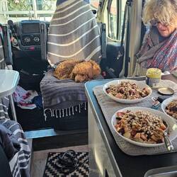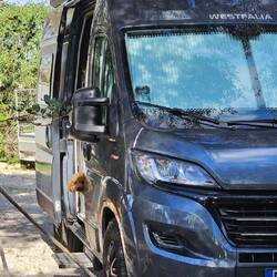 Ich werde ihr mal auf die Pfoten schauen und gucken, dass sie in den nächsten Wochen mehr Bilder für euch macht. Dafür habe ich sie aber überzeugt, noch ein Paar Bilder von unserem Stellplatz zu machen. Hier fühle ich mich pudelwohl! Ich muss nur mein Essen vor dem Kater Carlo verteidigen.