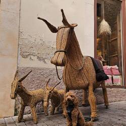 Am Donnerstag haben wir am Wasser gefrühstückt. Gerade rechtzeitig von dem Gewitter. Die Zeit des Regens haben wir genutzt, um nach Arta zu fahren. In Alcudia haben wir noch kurz einen Stopp gemacht und Bilder am Strand gemacht. Mama hatte am Abend zuvor so viel mit mir geschimpft, weil ich angeblich so viel an der Leine gezogen haben. Deswegen have ich mir in Arta eine neue Familie gesucht. Ich musste aber schnell feststellen, dass die Esel nur geflochten und gar nicht echt sind. Deswegen habe ich mich dann doch lieber wieder den anderen angeschlossen. Wir sind dann nach Vallgonera zu Omas Freundin gefahren. Auf dem Weg waren die Verrückten dann noch in Sa Ràpita in den Wellen. Ich habe erst an der Wasserkante geschimpft, aber mich dann einfach auf Mamas Sachen gelegt und gewartet bis die drei wiedergekommen sind. Weil es windig war, waren dort auch viele Kiter! Die hatten Hunde dabei, die mit durchs Wasser geflitzt sind.