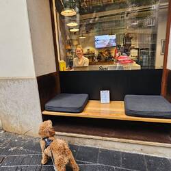 Am Mittwoch Nachmittag haben wir uns dann endlich wieder mit Oma und Opa getroffen. Da unser Palma-Trip ja beim letzten Versuch wortwörtlich ins Wasser gefallen ist, haben wir diesen nun nachgeholt. Dieses Mal mit Bus. Deshalb musste ich wieder in die blöde Tasche. Aber immerhin wurden wir nicht nass. Nach dem Ausflug nach Palma war ich hundemüde und habe den Camper bewacht, während die anderen Tapas essen gegangen sind. In den Lokal gab es sogar ein Hundemenü... Hätte man mir das mal vorher erzählt. Naja, was soll's.