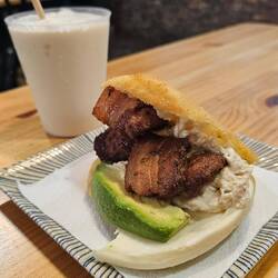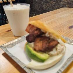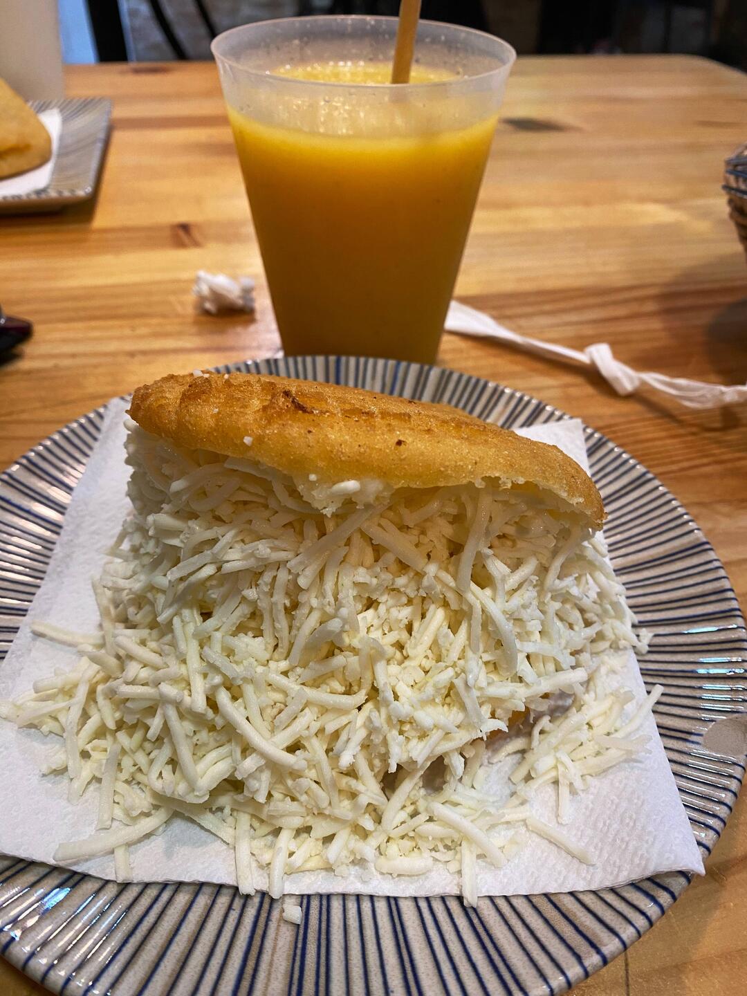 Unas arepas con jugo para coger energia antes del teatro. El Arepazo