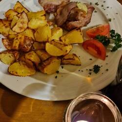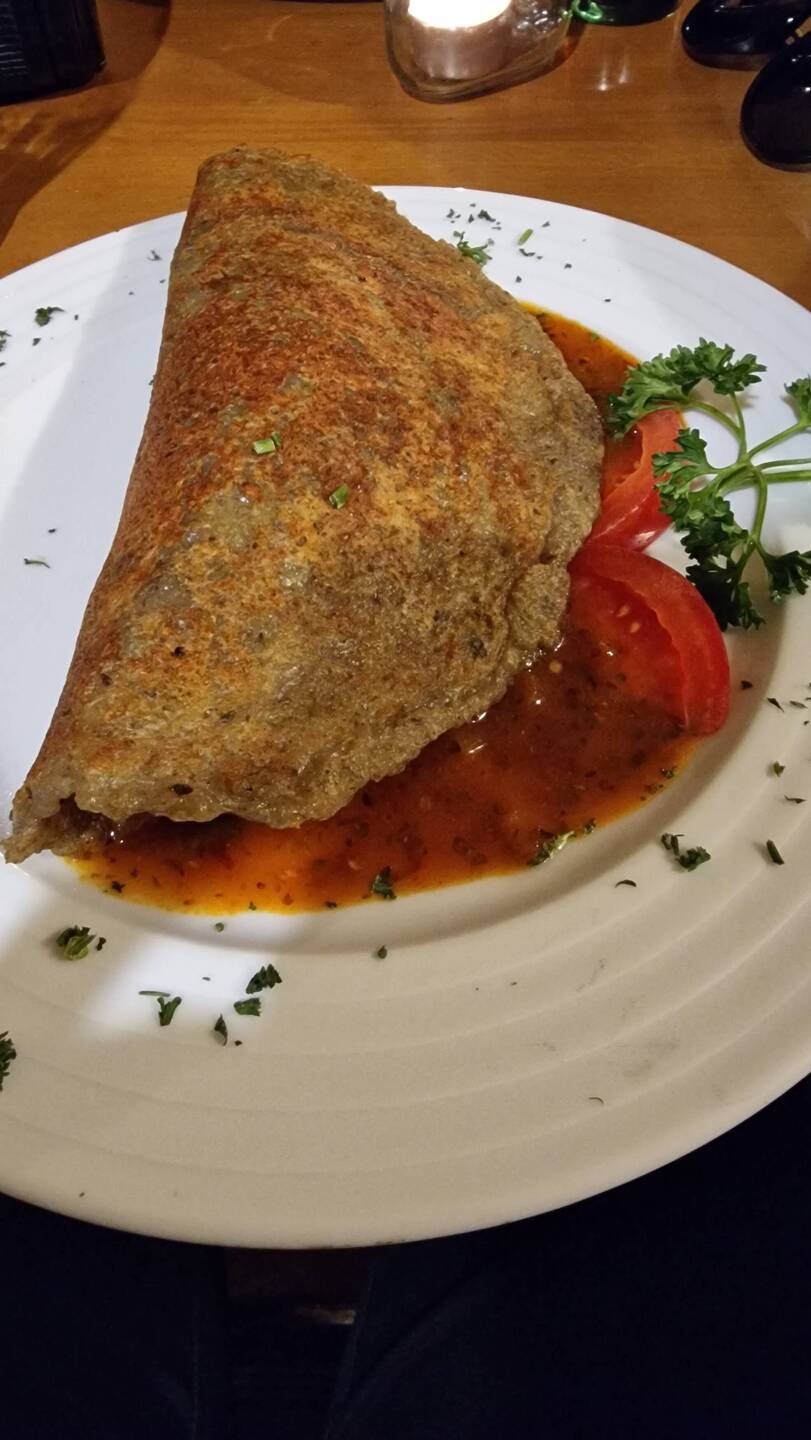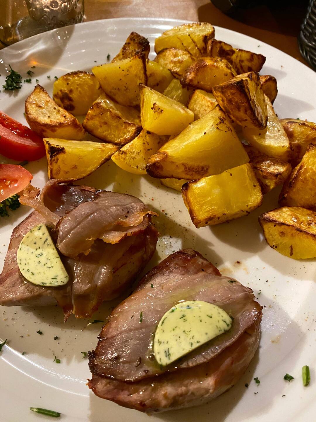 Para la hora de comer elegimos una cerveceria tradicional con buena puntuacion en Google. Hemos comido un plato de filetes de cerdo con bacon (algo pequeño) y un pancake releno de pollo con salsa deLæs mere