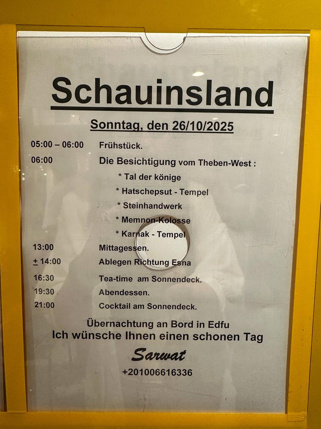 Flitterwochen Ägypten 2025TravelerShow tripAdd to bucket listRemove from bucket listShareDay 2Saturday, October 25, 2025 at 6:27 PM 🌙 29 °C Altitude: 68 m EgyptAl Maris25.636236, 32.59479925°38’10” N 32°35’41” E1Tagesplan Sonntag Yesterday in Egypt ⋅ 🌙 29 °C TravelerMega super Program viel viel spass😘🌈🍄☘️🍀😘😘😘😘2hReplyTranslate0 likes Show trip
