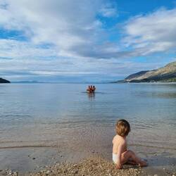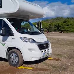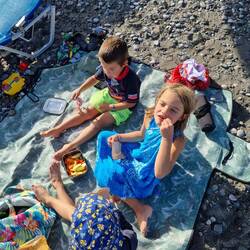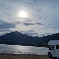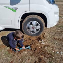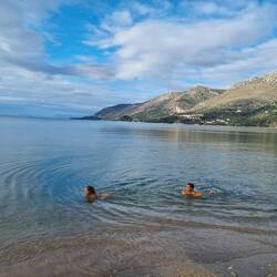 Wir feiern Fidelis Geburtstag auf einem Stellplatz am Meer. Nachmittags wird zum Abschied nochmals gebadet und abends gehen wir zum letzten Mal in Griechenland essen. Wir erwischen eine urigeLeia mais