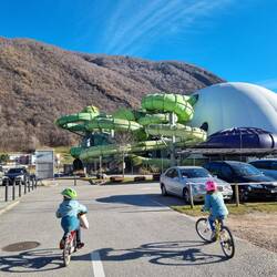 Nach unserem Ritt durch Italien gönnen wir uns und den Kindern eine kleine Verschnaufpause im Erlebnisbad Splash&Spa. Den schönen Weg dorthin durch den Wald genießen wir in derLeia mais