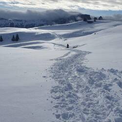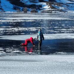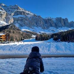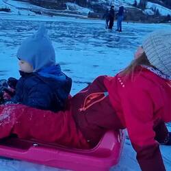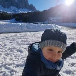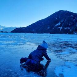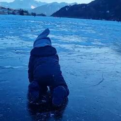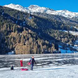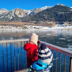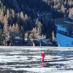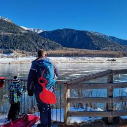 Wir genießen die Winterstimmung am Reschensee, wandern um und auf dem zugefrorenen Haidersee und gehen natürlich Ski fahren. Karlotta fährt wie immer harakiri, Friedrich braucht eine Weile umLeia mais