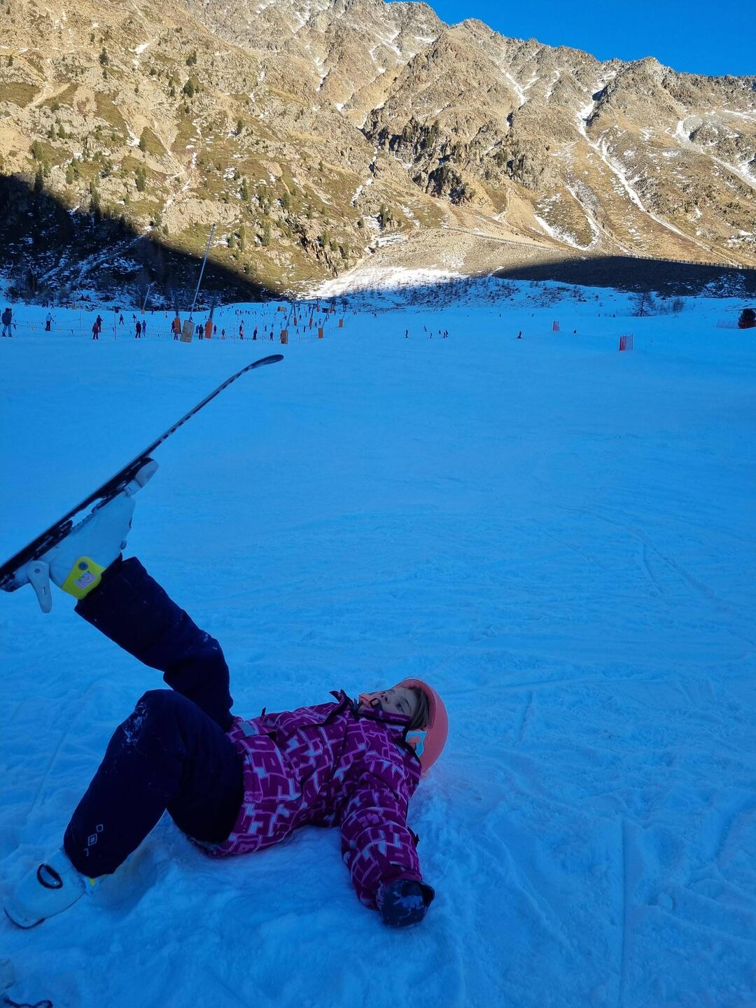 Wir genießen einen schönen Skitag in Nauders. Zum Mittagessen treffen wir uns auf der Lärchenhütte, Fidelis und Mama wandern dort hin, der Rest kommt auf Skiern angedüst. Auf dem Parkplatz direktLeia mais