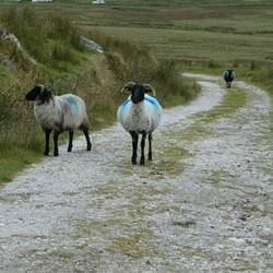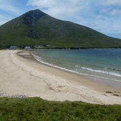 On espérait un super coucher de soleil, mais qq nuages se sont interposés. C’était quand même féérique. Le temps change à toute vitesse en Irlande. Une brume épaisse nous accueille au réveil, même les moutons se sont regroupés pour être protégés. La route descend de notre promontoire en serpentines jusqu'à Dooega, hameau avec des maisons blanches, typiques pour Achill Island. La seul touche de couleur se trouve sur les encadrements des fenêtres, des fois noir, d’autres rouge. Keel, le principal village de l'île et son camping ne font pas envie de s'arrêter, assez touristique. Nous allons jusqu'au point le plus à l'ouest Keem Beach. Il faut monter raide et on peut déjà appercevoir en contrebas la magnifique plage au sable blanc et à l'eau turquoise. Pour y arriver, faut descendre en lacets. Le parking y est déjà bien squatté par de nombreux cc. Ça pourrait aussi nous plaire malgré la promiscuité, mais il nous faut de l'eau pour notre réservoir aujourd'hui. Au milieu de l'île se trouve le Deserted Village, village abandonné pour de bon depuis les années 1940. Le temps gris rajoute encore à l'ambiance assez mystérieuse de ce site. Doogort se trouve sur la côte nord de Achill Island. Nous posons notre cc au petit camping Seals Caves, lové au fond du Silver Strand. Le majestueux Slievemore (672m) veille sur nous. Le soleil est revenu et nous suivons le conseil de la proprio, et allons dîner au The Cottage Tearoom, distant de 5min. à pied. Très bon conseil!Read more