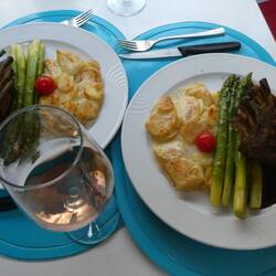 Le souper-cc de l'hôtel Raben était sublime: tatar de thon, carré d'agneau, asperges et gratin de pdt, et comme dessert: de l'ananas et de la glace. Le tout arrosé avec un Federweisser du village.